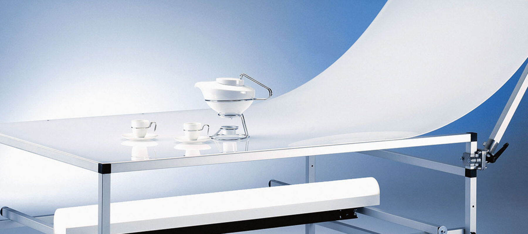 Ein stabiler und flexibler Aufnahmetisch, mit dem die Inszenierung von Produkten Spaß macht und höchste Ansprüche verwirklicht werden können. Die Plexiglasplatte lässt sich stufenlos bis zu einem Winkel von 90° neigen. Das Tischgestell besteht aus Aluminiumprofilen, die mittels Eckverbindern zusammengesteckt werden. Der untere Rahmen ermöglich die unkomplizierte Platzierung eines Slim Lights als Durchlichtquelle.